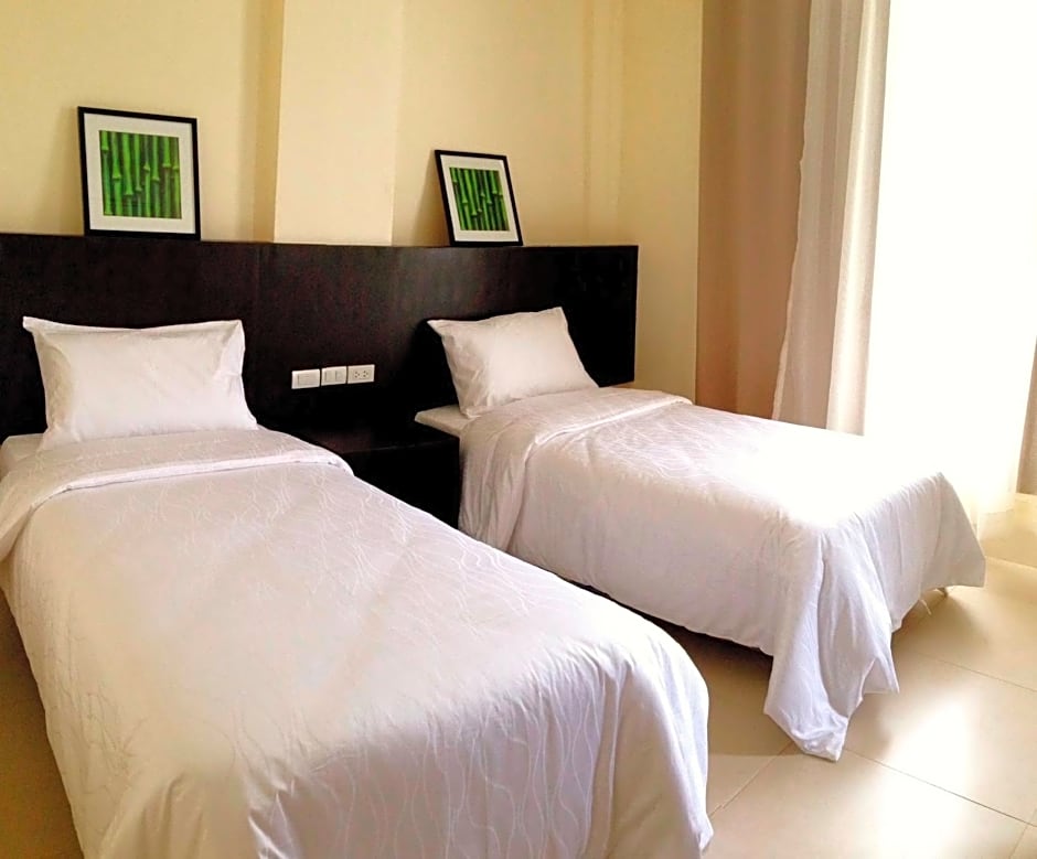 This room has 2 double beds and 1 single bed. Room can accommodate up to 5 guests.